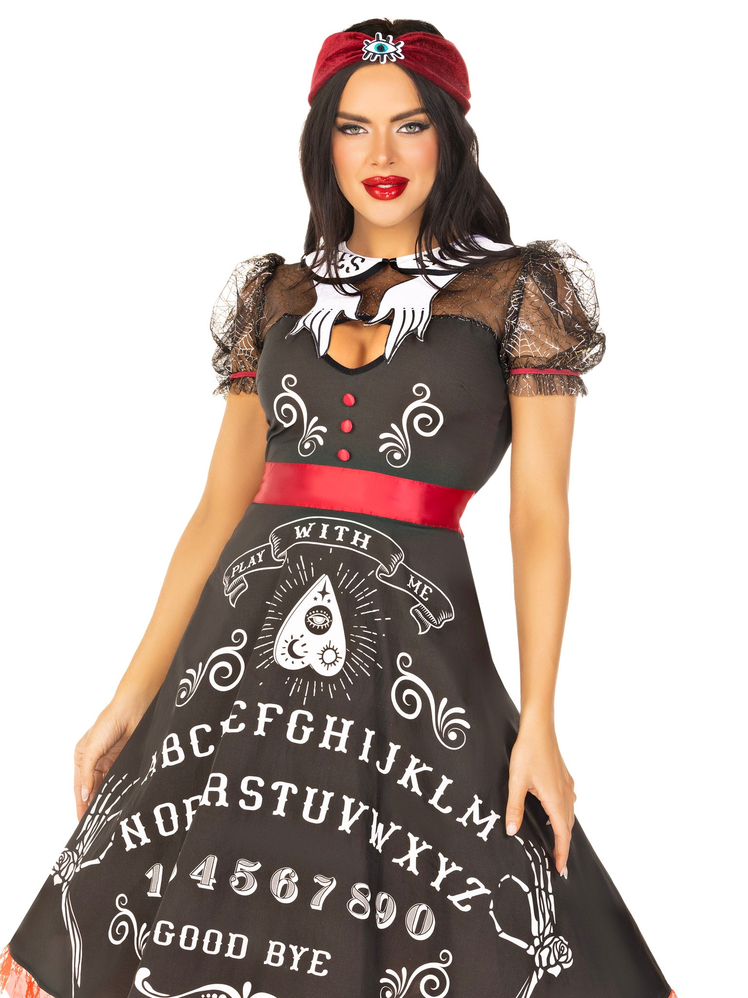 - Hand Collar Accent: The playful hand collar accent gives a nod to classic spirit board imagery, adding an eerie and stylish element to your costume.