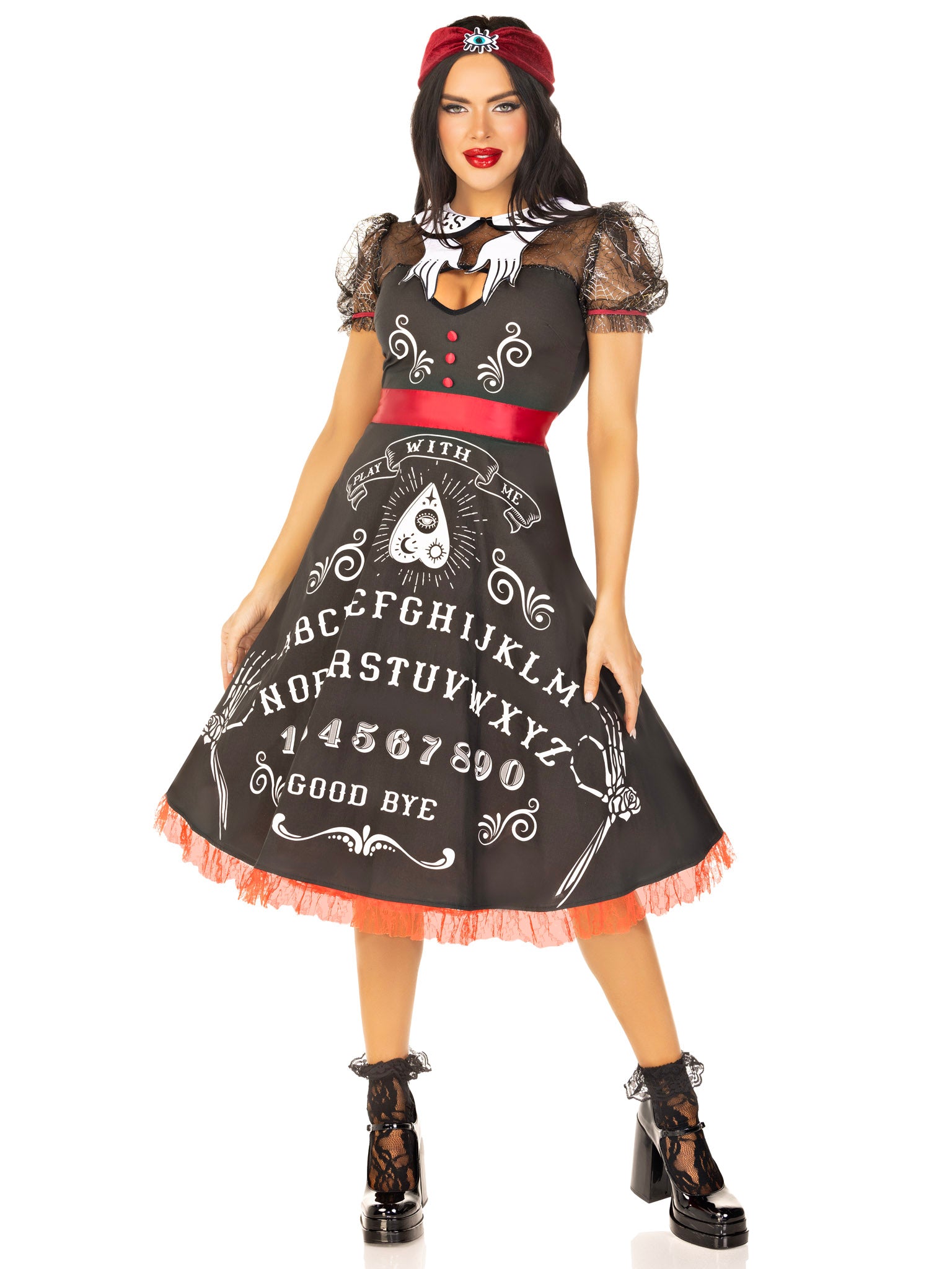 - Elaborate Printed Spirit Board Detail: The standout feature of this dress is its intricate printed spirit board design, making you the centerpiece of every mystical encounter and adding a unique twist to your spooky look.
